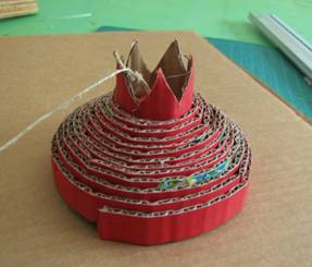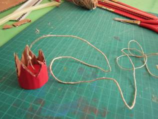 גוזרים ממנה משולשים, לכתר הרימון ומדביקים את סביב העיגול. משחילים את החוט דרך החורים וקושרים.
