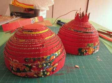 ממשיכים להדביק את הרצועות, בכל סיבוב מדביקים את הרצועות כמה מ"מ נמוך יותר מבסיבוב הקודם. מדביקים עד שמתקבל חצי כדור.