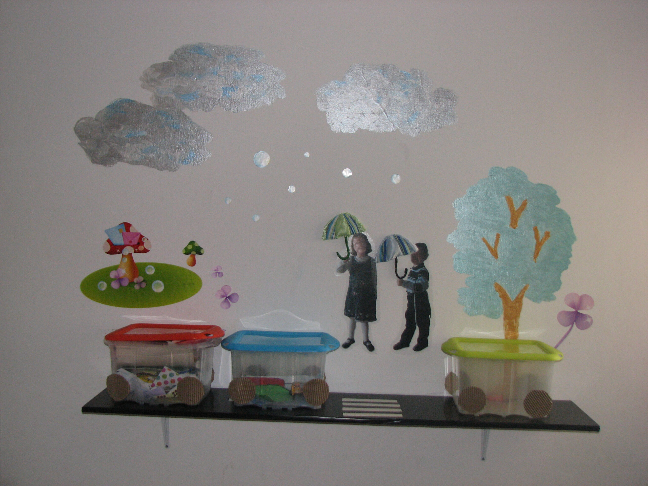 זהו קיר חדר הילדים שלנו. ציירתי וצבעתי אותו, את המטריה תפרתי עם מילוי אקרילן. המדף עטוף טפט.